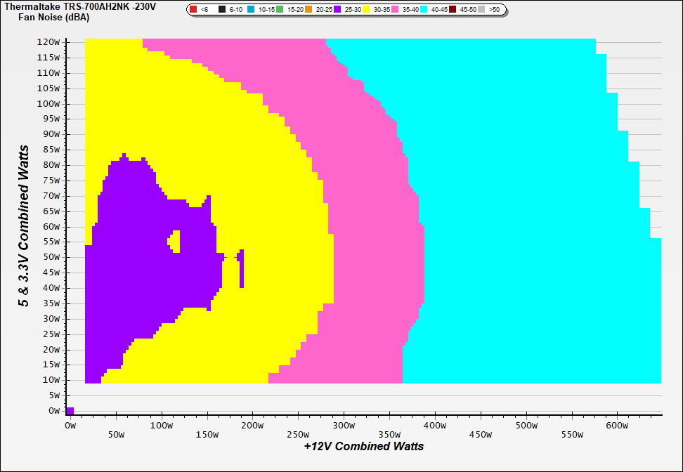 The PSU`s noise in its entire operational range and under 30-32 °C ambient is depicted in this graph. The X axis represents the load on the +12V rail(s) while the Y axis is the load on the minor rails