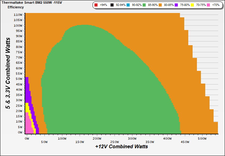 This graph depicts the PSU`s efficiency throughout its entire operational range. For the generation of the efficiency and noise graphs we set our loaders to auto mode through our custom-made software before trying thousands of possible load combinations