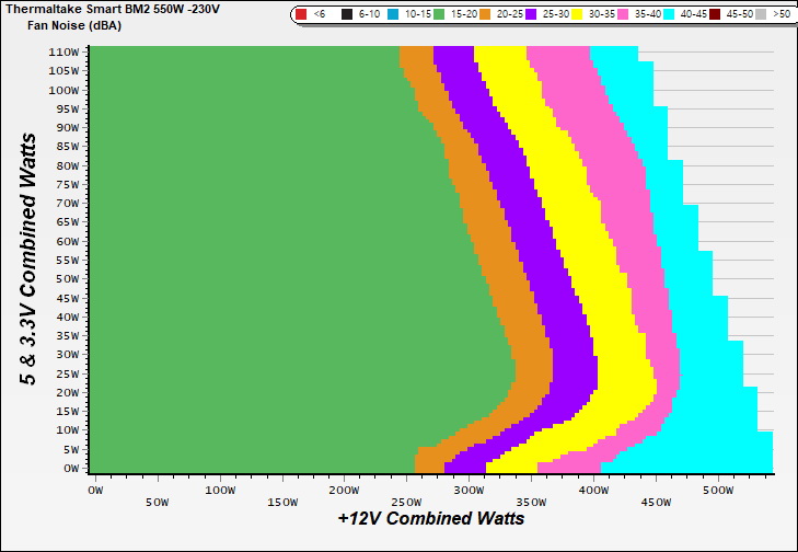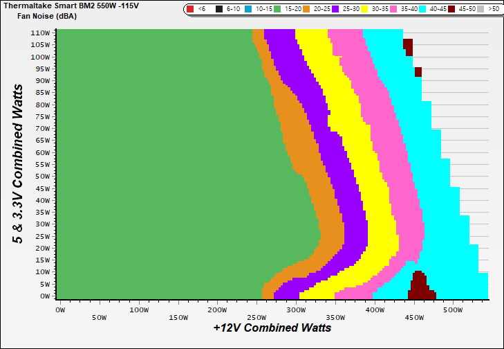 The PSU`s noise in its entire operational range and under 30-32 °C ambient is depicted in this graph. The X axis represents the load on the +12V rail(s) while the Y axis is the load on the minor rails