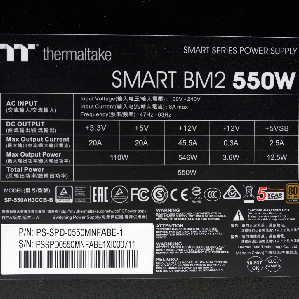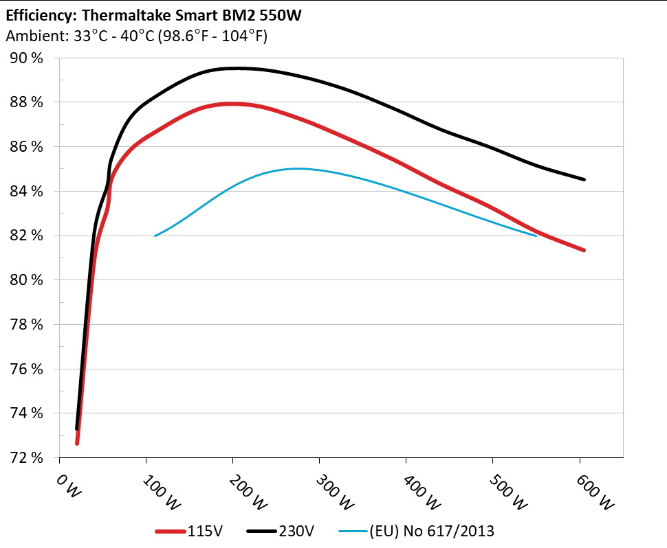 The PSU`s efficiency under high ambient temperatures with 115V and 230V input. For this graph the results of the 10-110% load regulation table are used