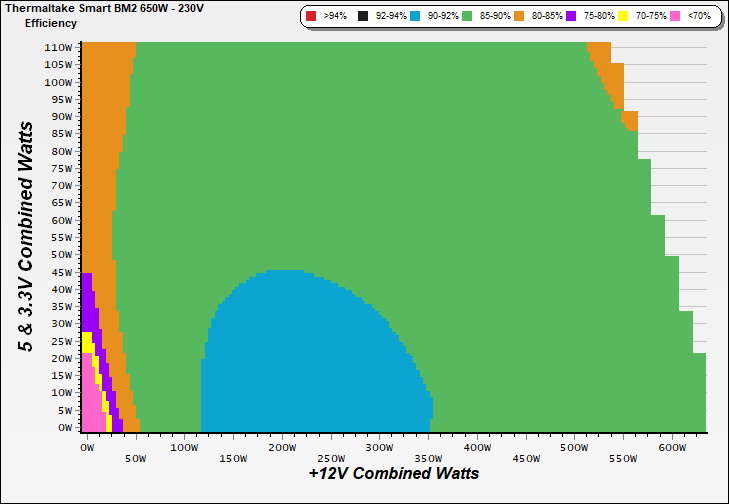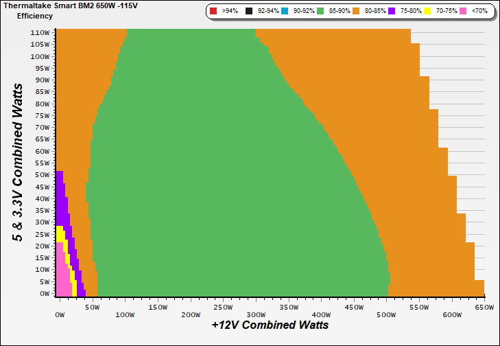 This graph depicts the PSU`s efficiency throughout its entire operational range. For the generation of the efficiency and noise graphs we set our loaders to auto mode through our custom-made software before trying thousands of possible load combinations