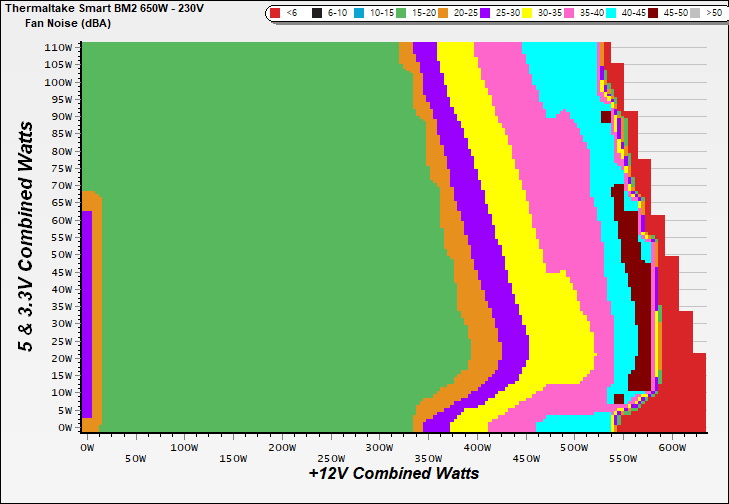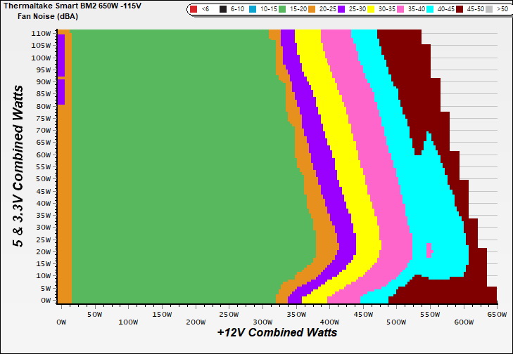 The PSU`s noise in its entire operational range and under 30-32 °C ambient is depicted in this graph. The X axis represents the load on the +12V rail(s) while the Y axis is the load on the minor rails