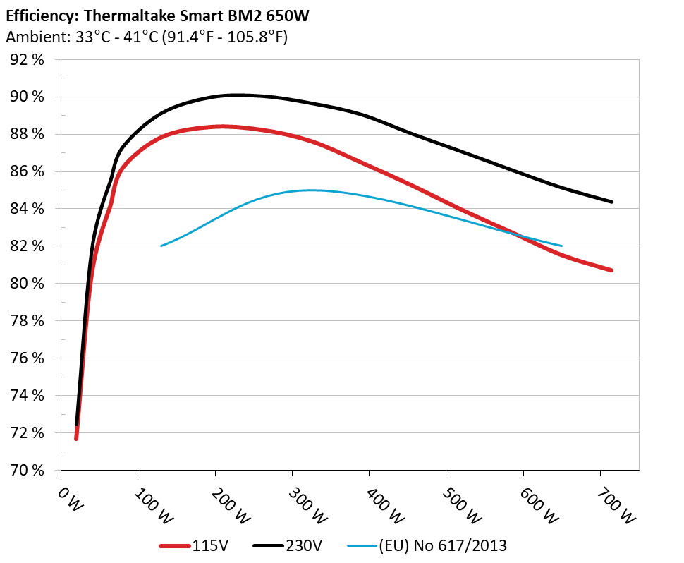 The PSU`s efficiency under high ambient temperatures with 115V and 230V input. For this graph the results of the 10-110% load regulation table are used