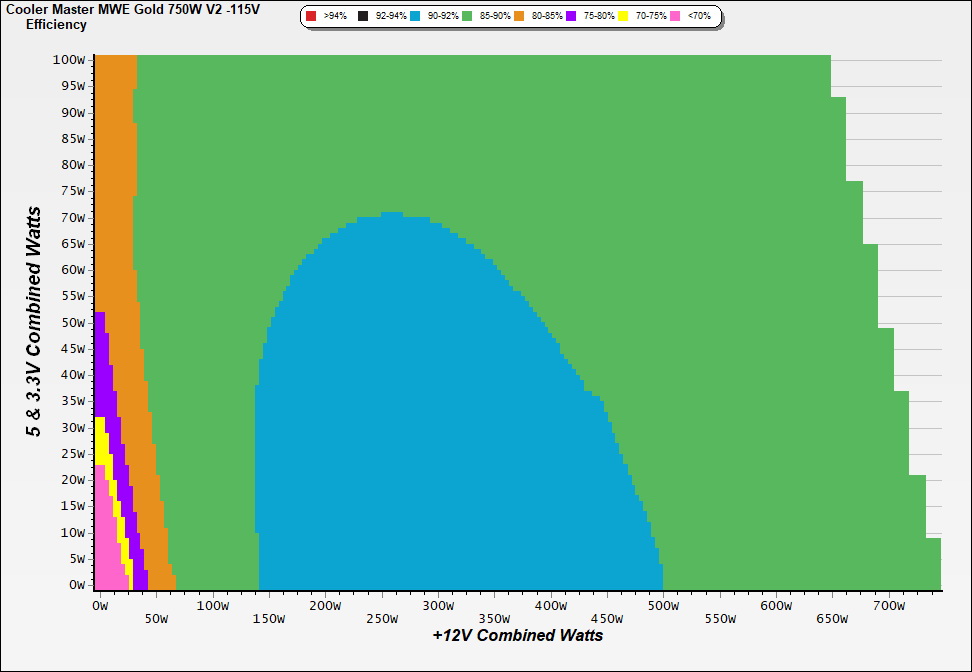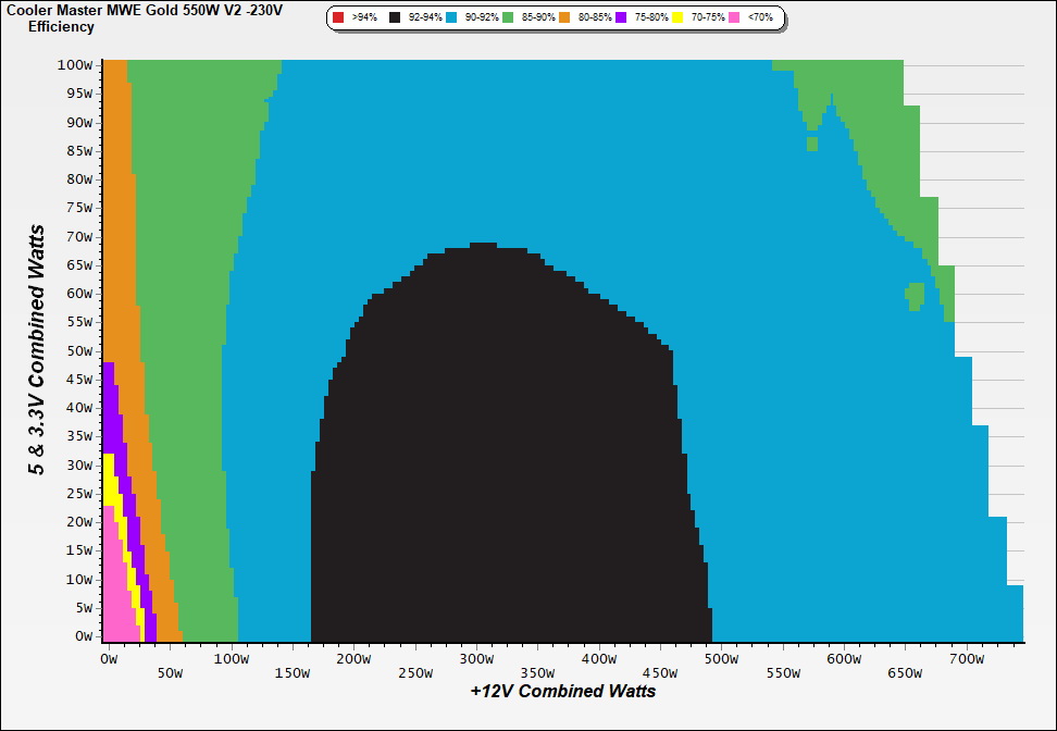 This graph depicts the PSU`s efficiency throughout its entire operational range. For the generation of the efficiency and noise graphs we set our loaders to auto mode through our custom-made software before trying thousands of possible load combinations