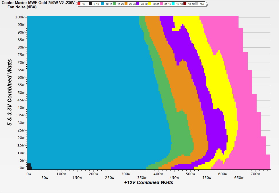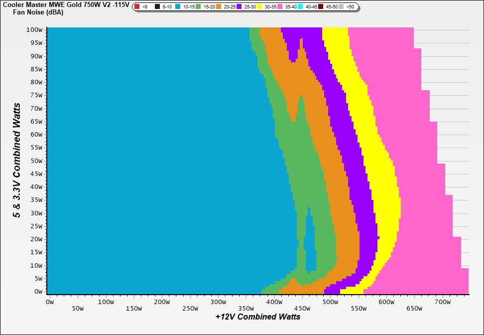 The PSU`s noise in its entire operational range and under 30-32 °C ambient is depicted in this graph. The X axis represents the load on the +12V rail(s) while the Y axis is the load on the minor rails
