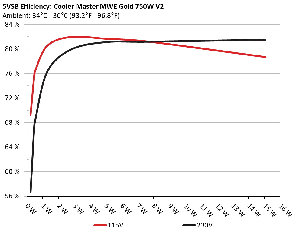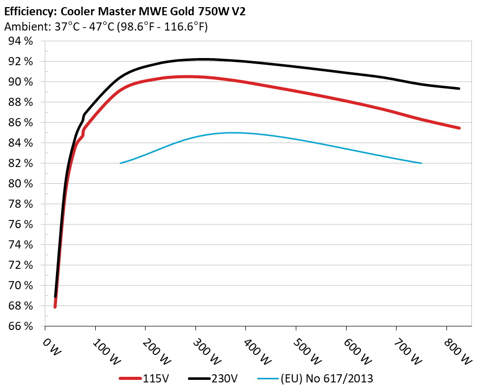The PSU`s efficiency under high ambient temperatures with 115V and 230V input. For this graph the results of the 10-110% load regulation table are used