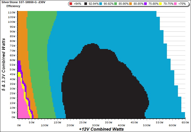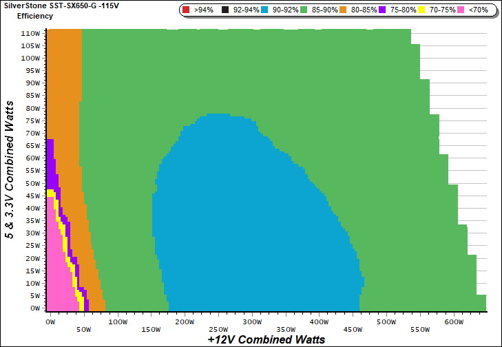 This graph depicts the PSU`s efficiency throughout its entire operational range. For the generation of the efficiency and noise graphs we set our loaders to auto mode through our custom-made software before trying thousands of possible load combinations.