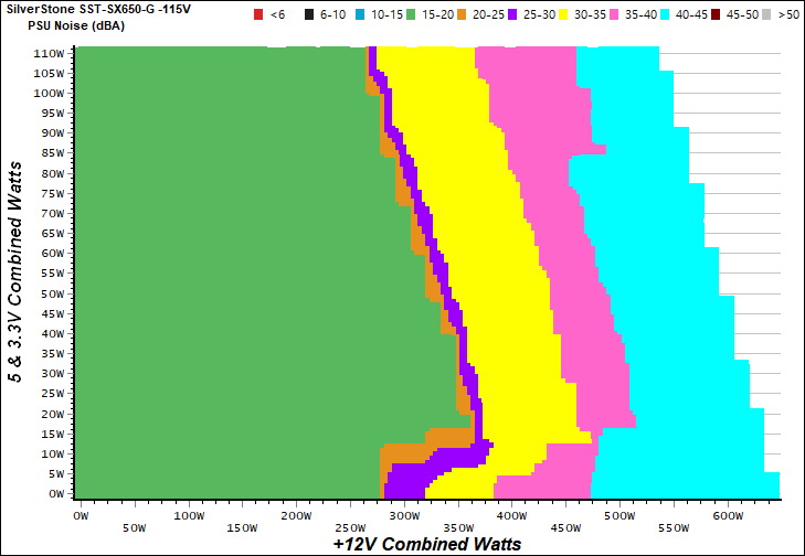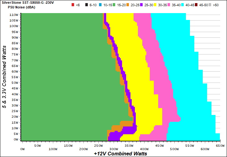 The PSU`s noise in its entire operational range and under 30-32 °C ambient is depicted in this graph. The X axis represents the load on the +12V rail(s) while the Y axis is the load on the minor rails.