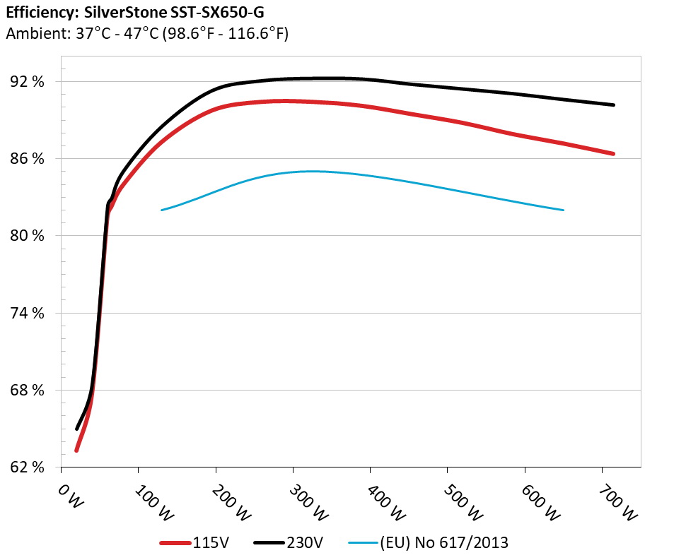 The PSU`s efficiency under high ambient temperatures with 115V and 230V input. For this graph the results of the 10-110% load regulation table are used.