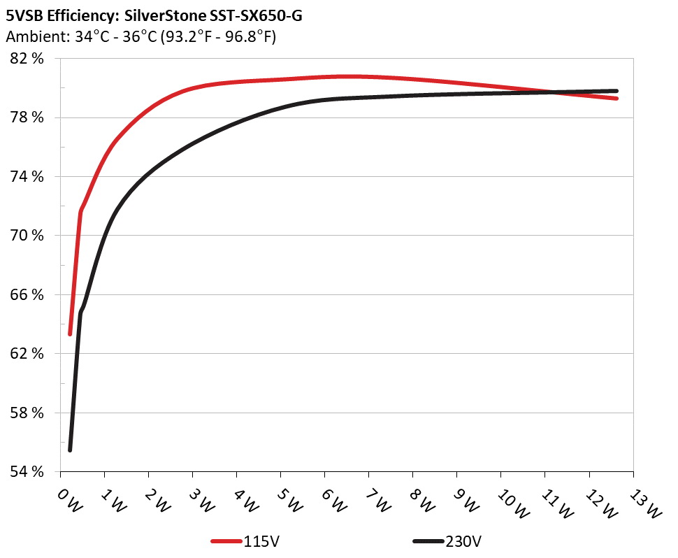 This graph depicts the efficiency levels of the 5VSB rail with 115V and 230V input.