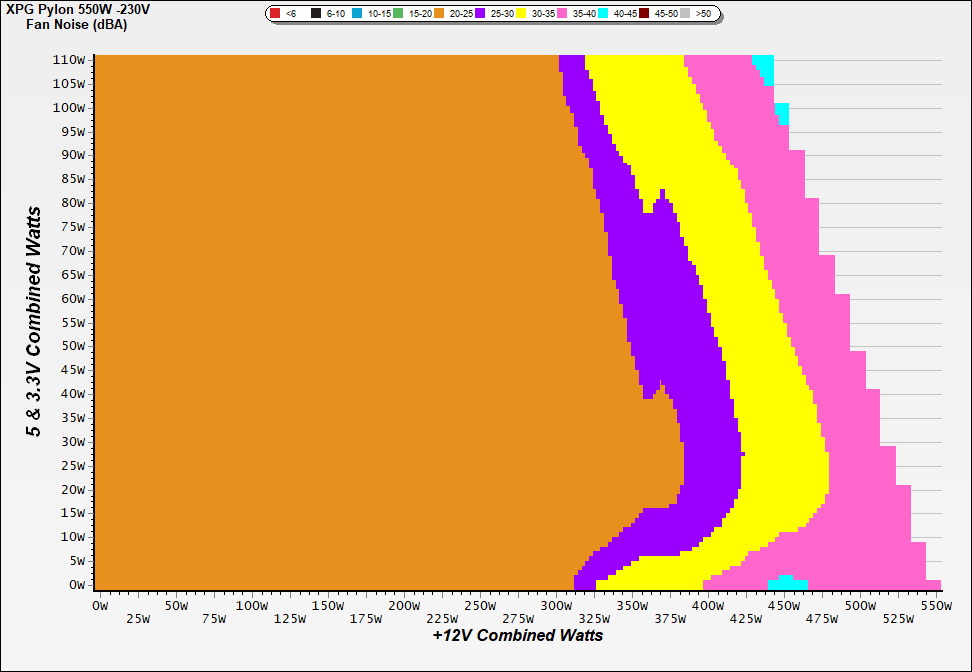 The PSU`s noise in its entire operational range and under 30-32 °C ambient is depicted in this graph. The X axis represents the load on the +12V rail(s) while the Y axis is the load on the minor rails