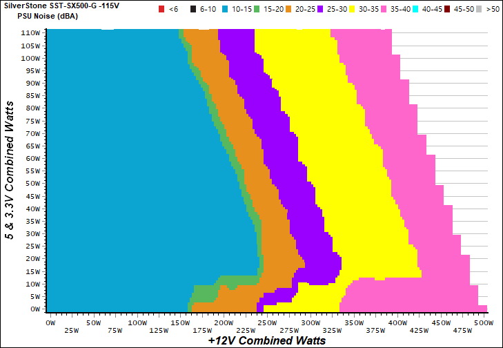 The PSU`s noise in its entire operational range and under 30-32 °C ambient is depicted in this graph. The X axis represents the load on the +12V rail(s) while the Y axis is the load on the minor rails.