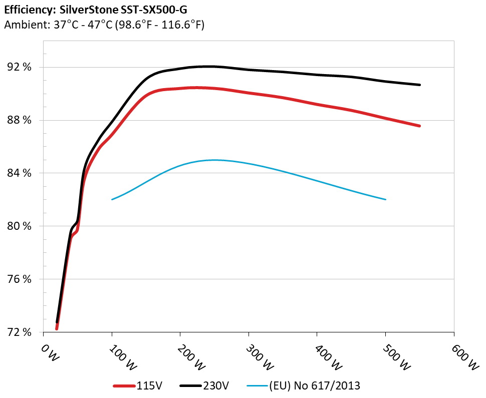 The PSU`s efficiency under high ambient temperatures with 115V and 230V input. For this graph the results of the 10-110% load regulation table are used.