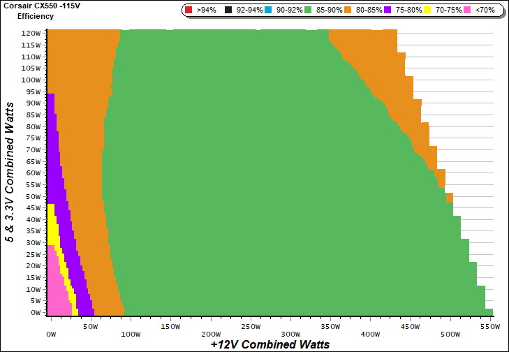 This graph depicts the PSU`s efficiency throughout its entire operational range. For the generation of the efficiency and noise graphs we set our loaders to auto mode through our custom-made software before trying thousands of possible load combinations.