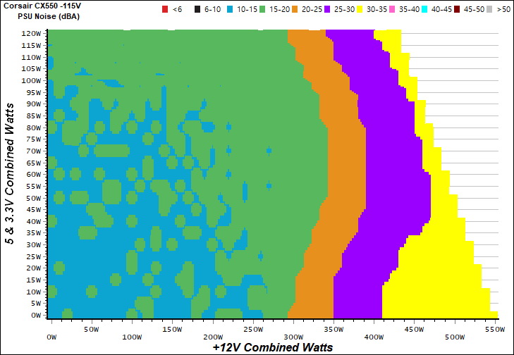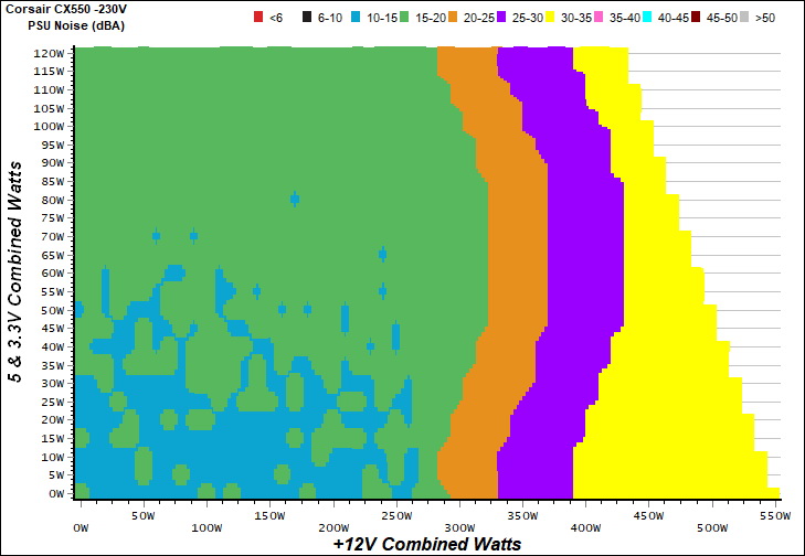 The PSU`s noise in its entire operational range and under 30-32 °C ambient is depicted in this graph. The X axis represents the load on the +12V rail(s) while the Y axis is the load on the minor rails.