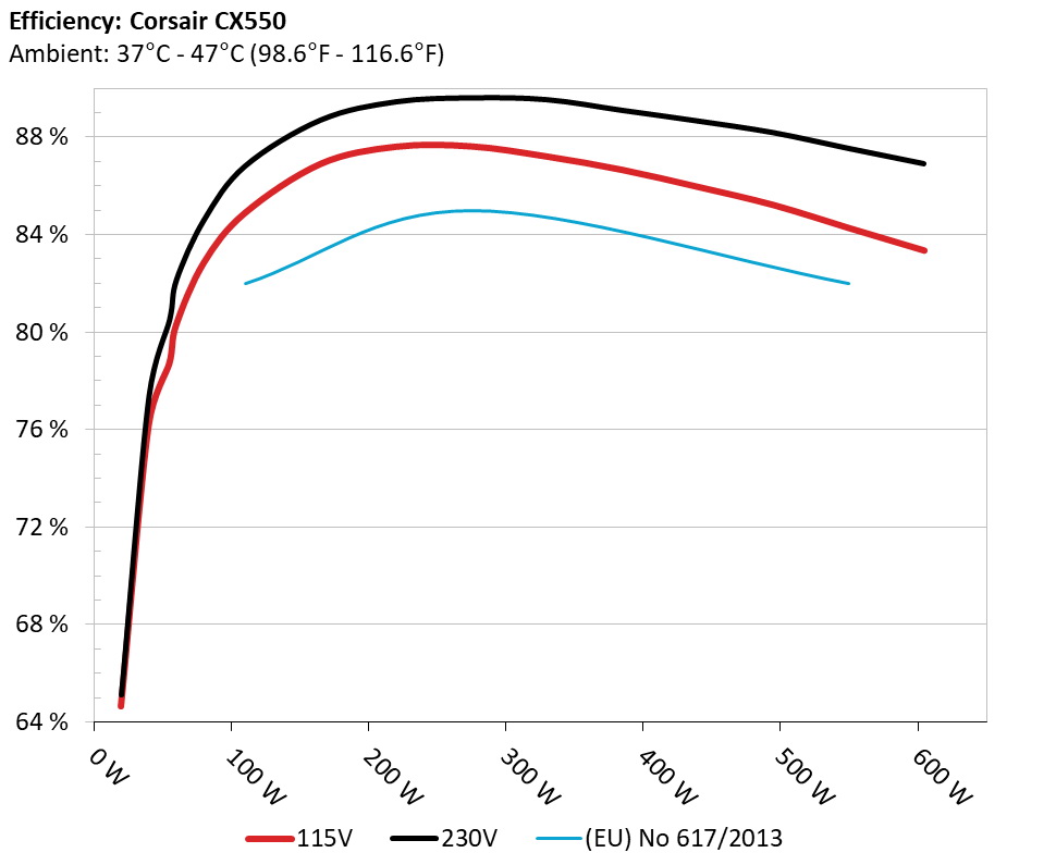 The PSU`s efficiency under high ambient temperatures with 115V and 230V input. For this graph the results of the 10-110% load regulation table are used.