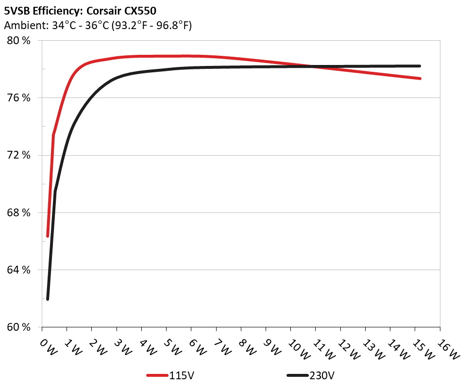 This graph depicts the efficiency levels of the 5VSB rail with 115V and 230V input.