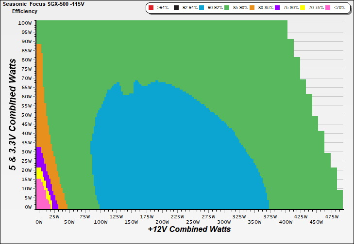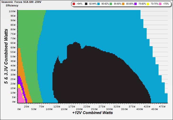 This graph depicts the PSU`s efficiency throughout its entire operational range. For the generation of the efficiency and noise graphs we set our loaders to auto mode through our custom-made software before trying thousands of possible load combinations