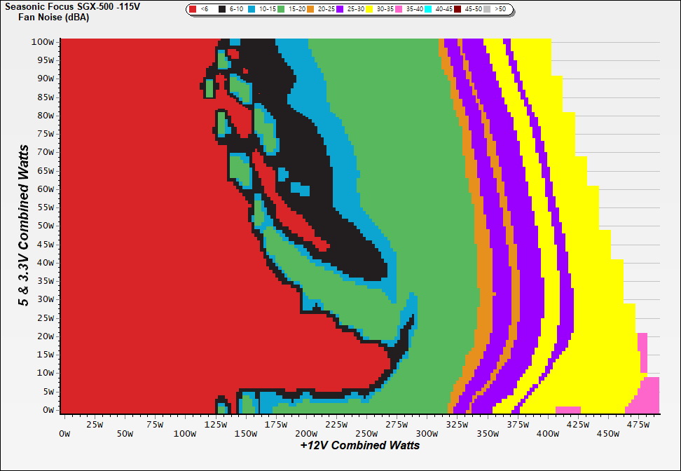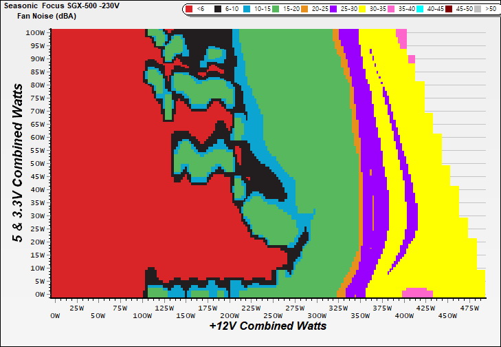 The PSU`s noise in its entire operational range and under 30-32 °C ambient is depicted in this graph. The X axis represents the load on the +12V rail(s) while the Y axis is the load on the minor rails