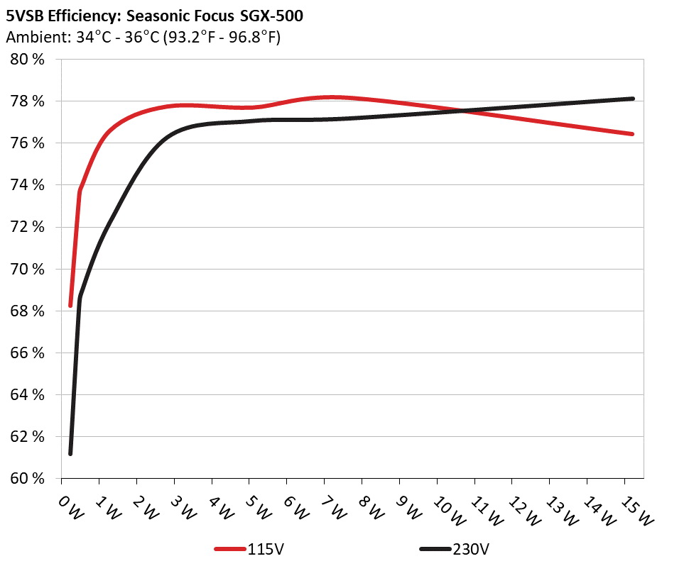 This graph depicts the efficiency levels of the 5VSB rail with 115V and 230V input