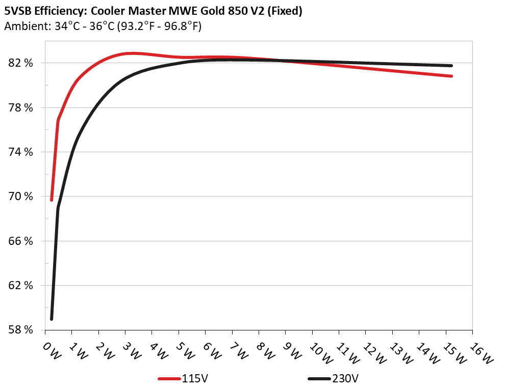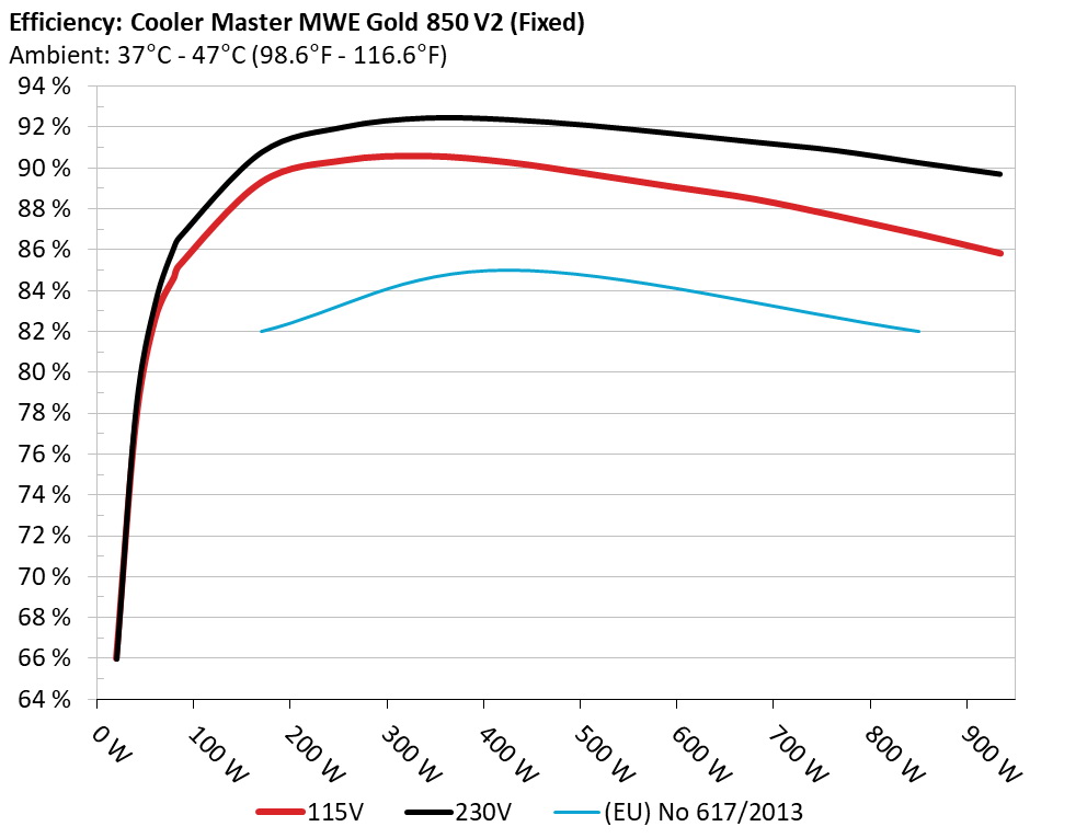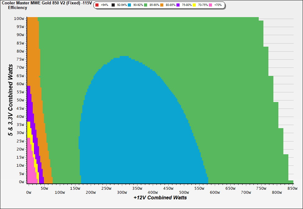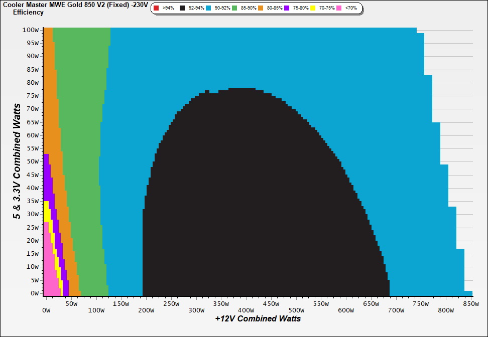 This graph depicts the PSU`s efficiency throughout its entire operational range. For the generation of the efficiency and noise graphs we set our loaders to auto mode through our custom-made software before trying thousands of possible load combinations