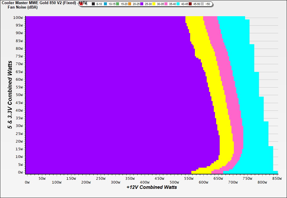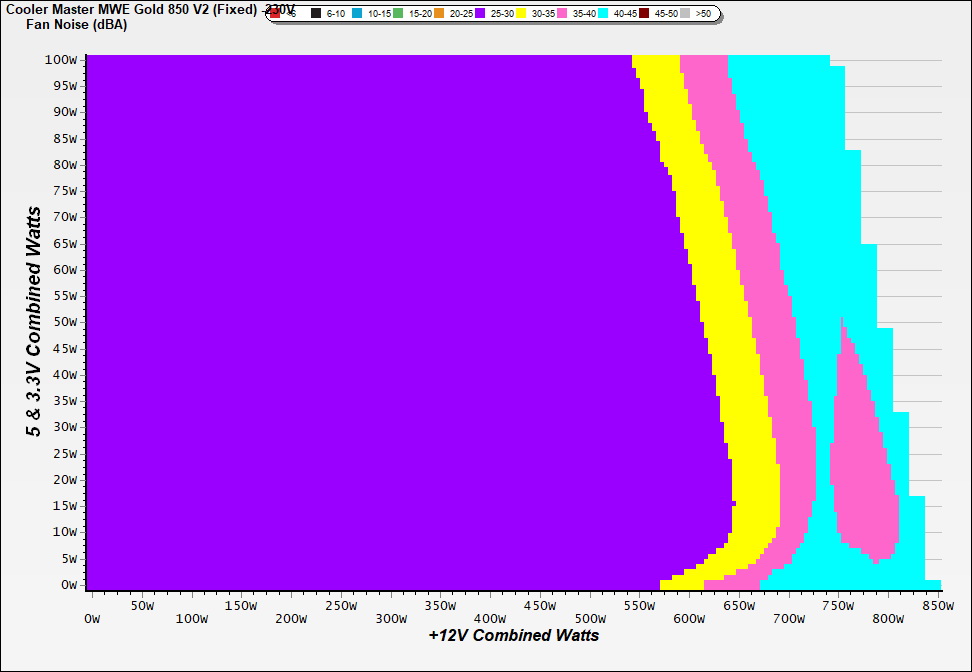 The PSU`s noise in its entire operational range and under 30-32 °C ambient is depicted in this graph. The X axis represents the load on the +12V rail(s) while the Y axis is the load on the minor rails