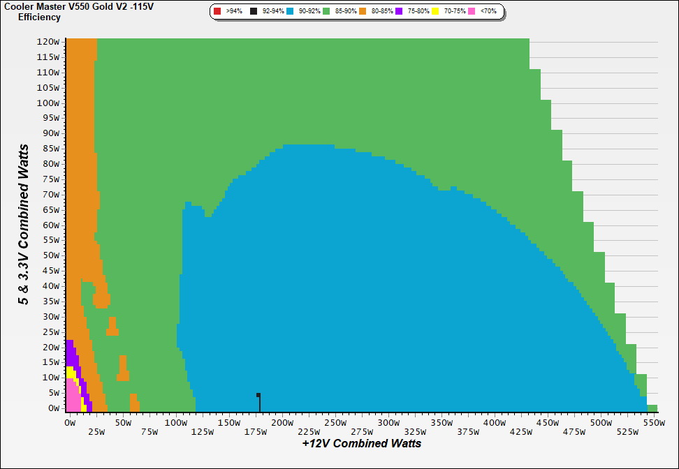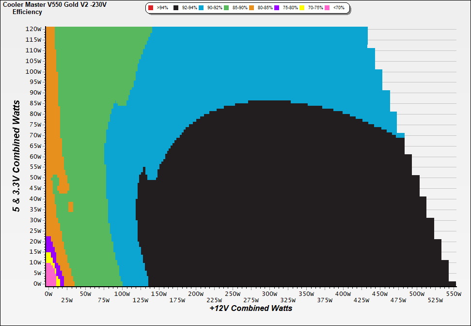 This graph depicts the PSU`s efficiency throughout its entire operational range. For the generation of the efficiency and noise graphs we set our loaders to auto mode through our custom-made software before trying thousands of possible load combinations