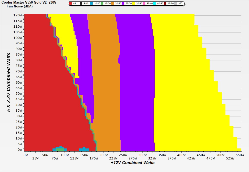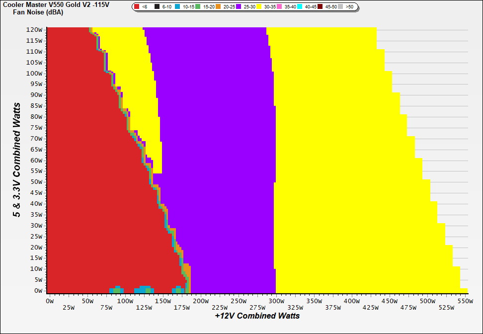 The PSU`s noise in its entire operational range and under 30-32 °C ambient is depicted in this graph. The X axis represents the load on the +12V rail(s) while the Y axis is the load on the minor rails