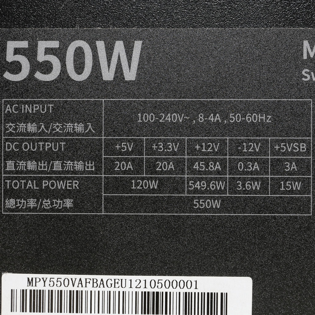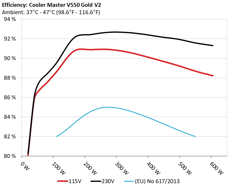 The PSU`s efficiency under high ambient temperatures with 115V and 230V input. For this graph the results of the 10-110% load regulation table are used