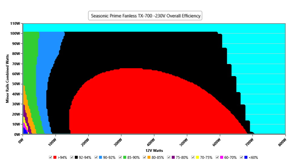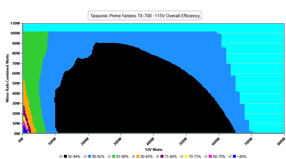 This graph depicts the PSU`s efficiency throughout its entire operational range. For the generation of the efficiency and noise graphs we set our loaders to auto mode through our custom-made software before trying thousands of possible load combinations