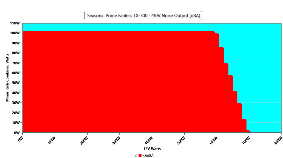 The PSU`s noise in its entire operational range and under 30-32 °C ambient is depicted in this graph. The X axis represents the load on the +12V rail(s) while the Y axis is the load on the minor rails