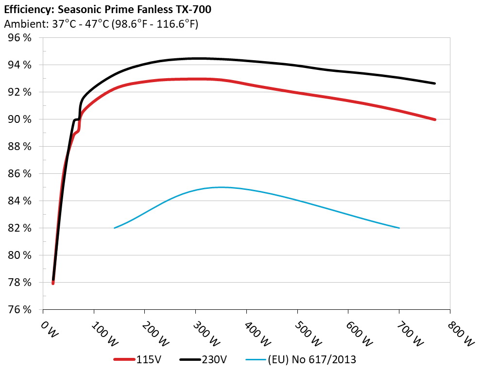 The PSU`s efficiency under high ambient temperatures with 115V and 230V input. For this graph the results of the 10-110% load regulation table are used