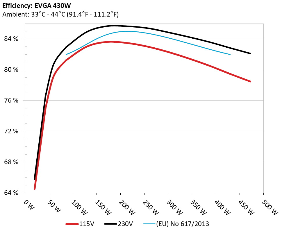 The PSU`s efficiency under high ambient temperatures with 115V and 230V input. For this graph the results of the 10-110% load regulation table are used.