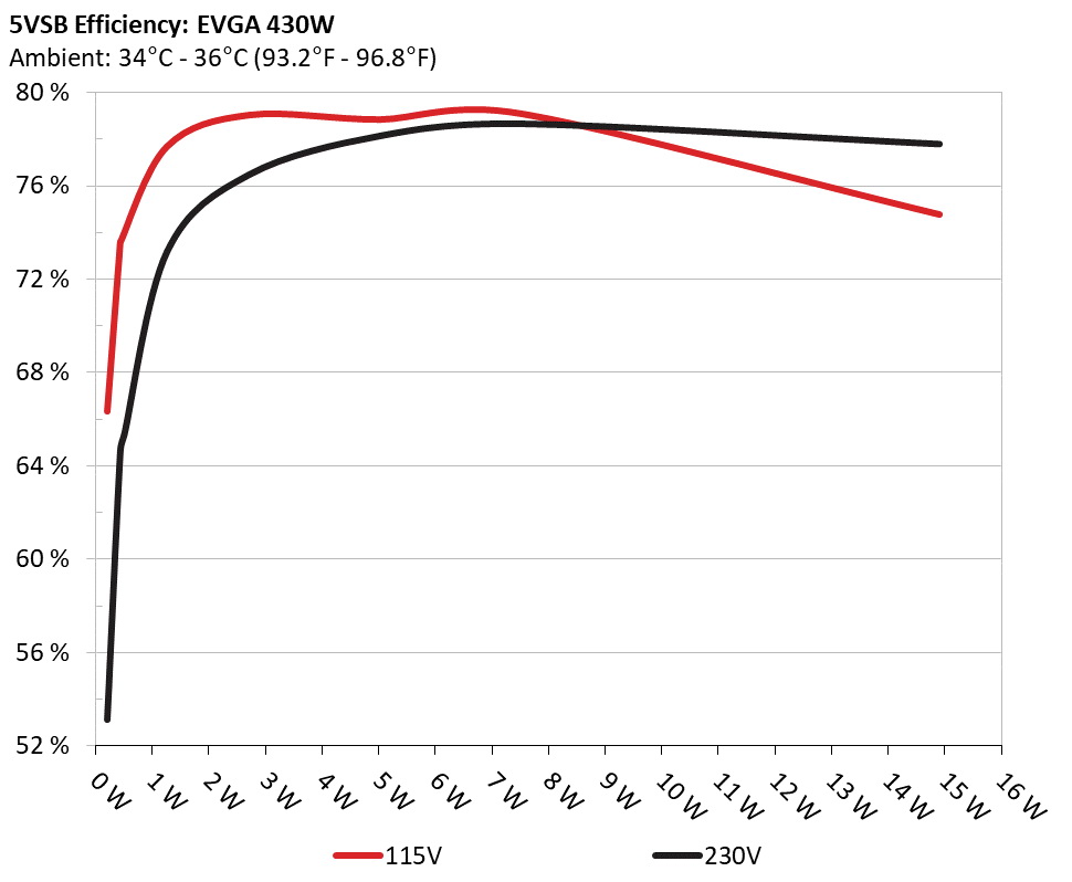 This graph depicts the efficiency levels of the 5VSB rail with 115V and 230V input.