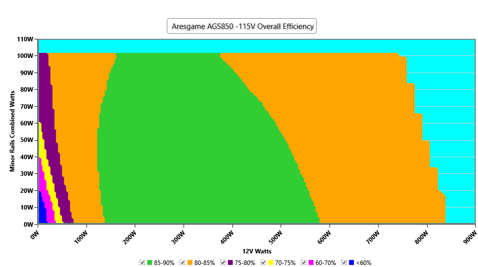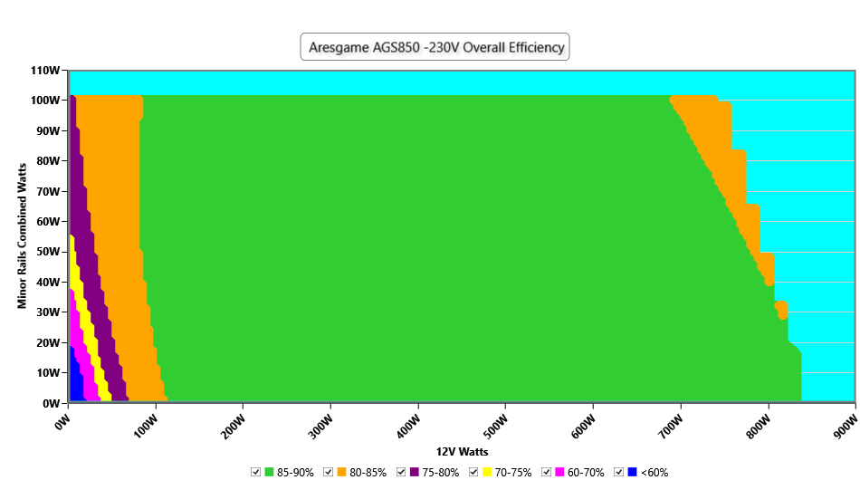 This graph depicts the PSU`s efficiency throughout its entire operational range. For the generation of the efficiency and noise graphs we set our loaders to auto mode through our custom-made software before trying thousands of possible load combinations