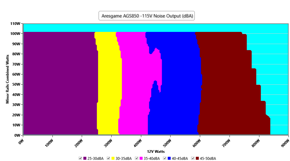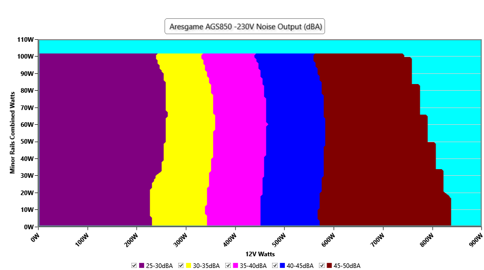 The PSU`s noise in its entire operational range and under 30-32 °C ambient is depicted in this graph. The X axis represents the load on the +12V rail(s) while the Y axis is the load on the minor rails