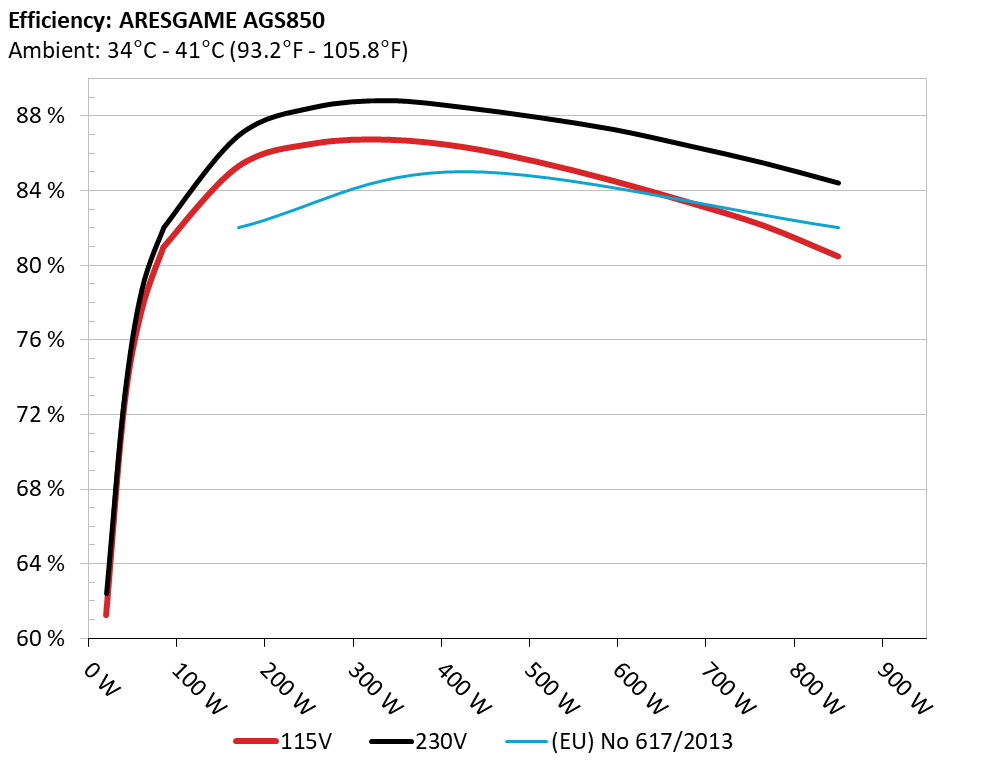 The PSU`s efficiency under high ambient temperatures with 115V and 230V input. For this graph the results of the 10-110% load regulation table are used