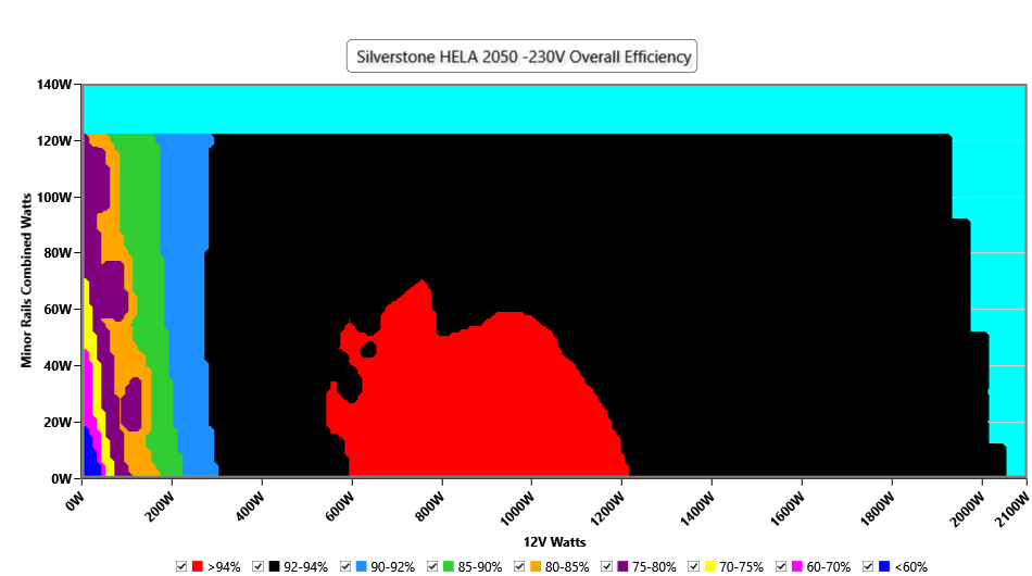 This graph depicts the PSU`s efficiency throughout its entire operational range. For the generation of the efficiency and noise graphs we set our loaders to auto mode through our custom-made software before trying thousands of possible load combinations