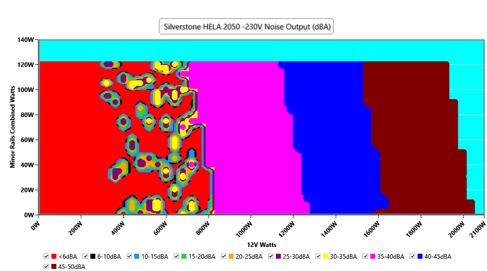 The PSU`s noise in its entire operational range and under 30-32 °C ambient is depicted in this graph. The X axis represents the load on the +12V rail(s) while the Y axis is the load on the minor rails