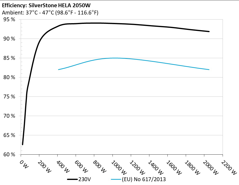The PSU`s efficiency under high ambient temperatures with 115V and 230V input. For this graph the results of the 10-110% load regulation table are used