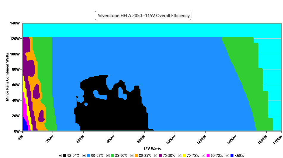 This graph depicts the PSU`s efficiency throughout its entire operational range. For the generation of the efficiency and noise graphs we set our loaders to auto mode through our custom-made software before trying thousands of possible load combinations