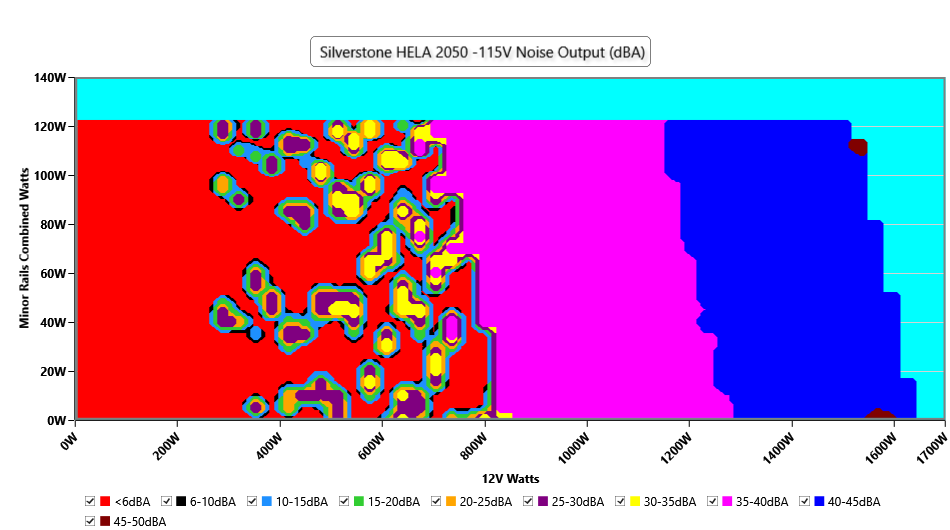 The PSU`s noise in its entire operational range and under 30-32 °C ambient is depicted in this graph. The X axis represents the load on the +12V rail(s) while the Y axis is the load on the minor rails