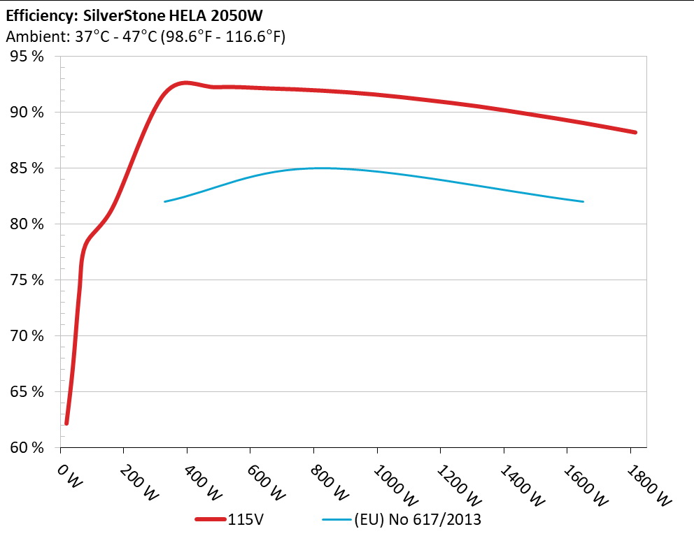 The PSU`s efficiency under high ambient temperatures with 115V and 230V input. For this graph the results of the 10-110% load regulation table are used