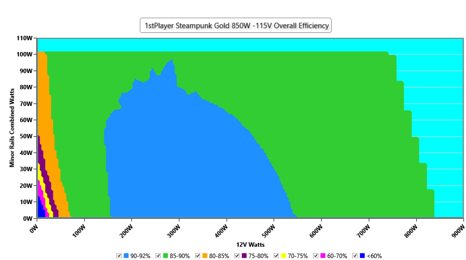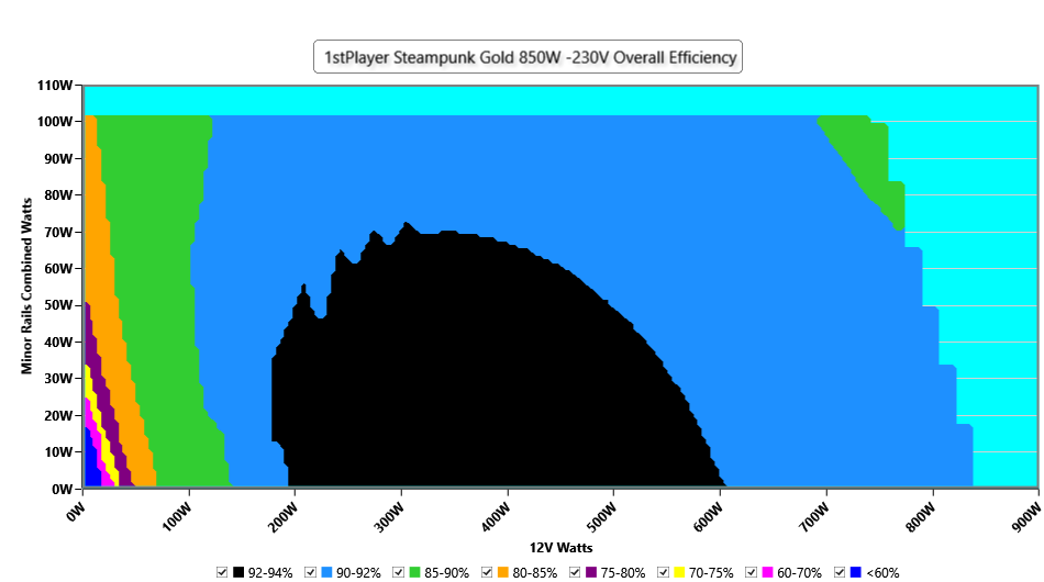 This graph depicts the PSU`s efficiency throughout its entire operational range. For the generation of the efficiency and noise graphs we set our loaders to auto mode through our custom-made software before trying thousands of possible load combinations