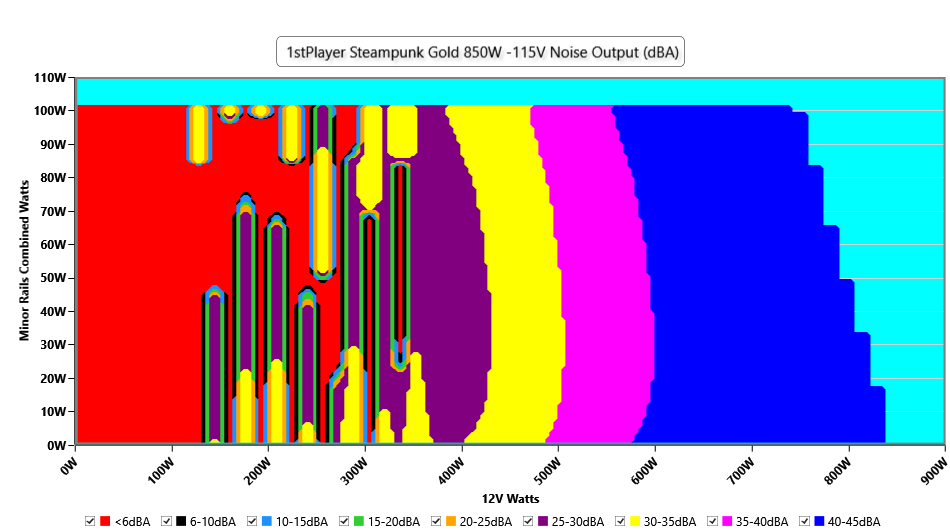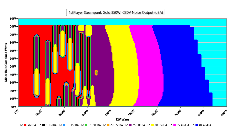 The PSU`s noise in its entire operational range and under 30-32 °C ambient is depicted in this graph. The X axis represents the load on the +12V rail(s) while the Y axis is the load on the minor rails