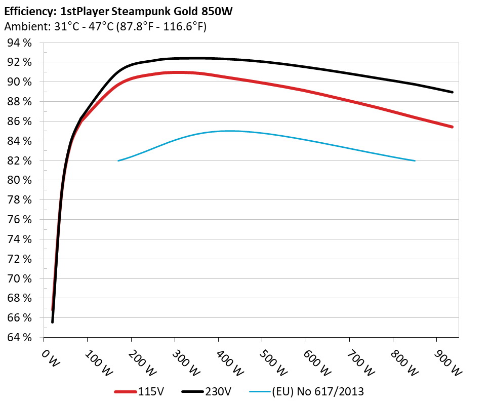 The PSU`s efficiency under high ambient temperatures with 115V and 230V input. For this graph the results of the 10-110% load regulation table are used