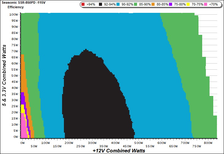 This graph depicts the PSU`s efficiency throughout its entire operational range. For the generation of the efficiency and noise graphs we set our loaders to auto mode through our custom-made software before trying thousands of possible load combinations.