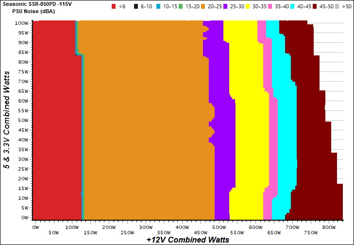 The PSU`s noise in its entire operational range and under 30-32 °C ambient is depicted in this graph. The X axis represents the load on the +12V rail(s) while the Y axis is the load on the minor rails.