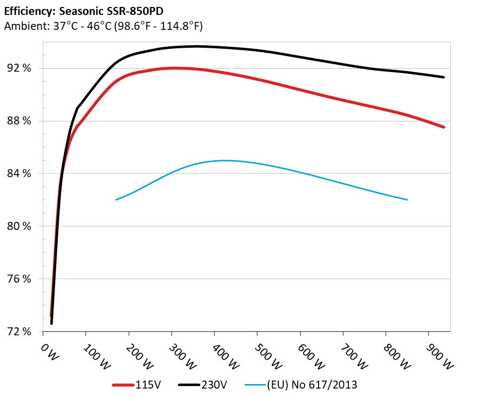 The PSU`s efficiency under high ambient temperatures with 115V and 230V input. For this graph the results of the 10-110% load regulation table are used.
