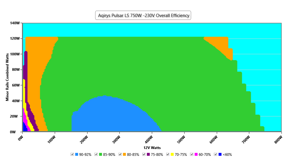 This graph depicts the PSU`s efficiency throughout its entire operational range. For the generation of the efficiency and noise graphs we set our loaders to auto mode through our custom-made software before trying thousands of possible load combinations